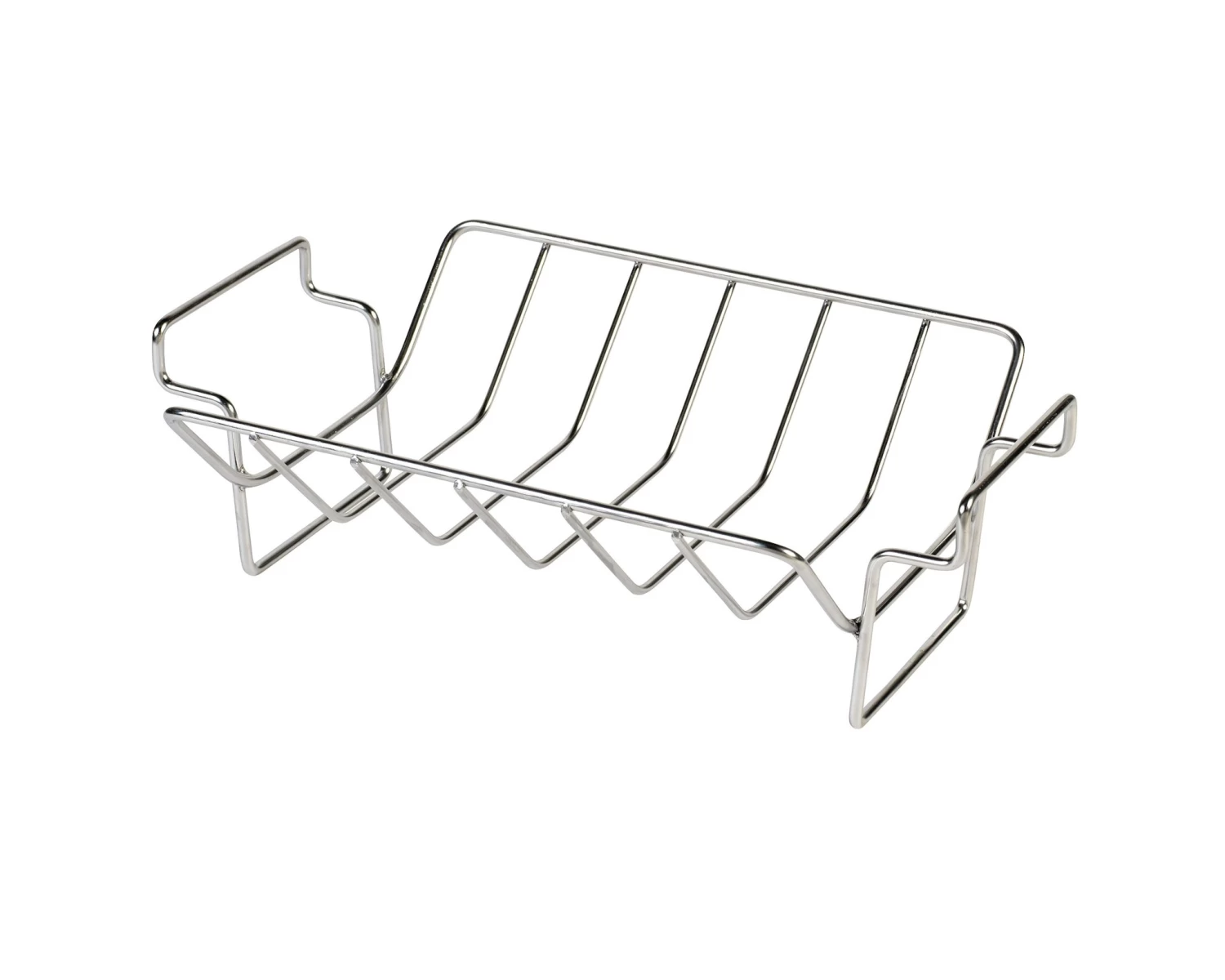 Der multifunktionale Bratenkorb (Ribs and Roasting Rack) ist ideal zum Braten von Fleisch und Geflügel. Aufrecht stehend ist es ein Bratenkorb: geeignet zum langsamen Garen von großen Fleischstücken oder (gefülltem) Geflügel.