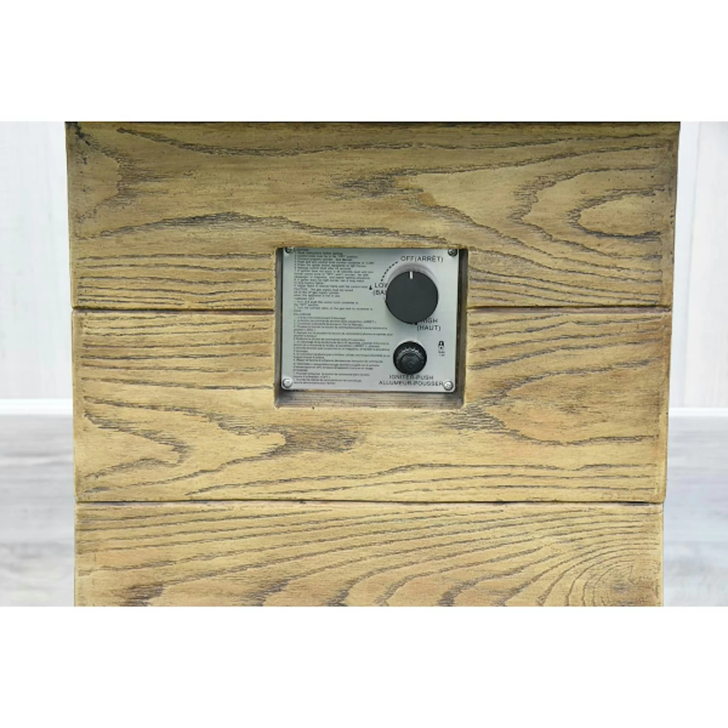 Gasfeuerstelle Rova Bar aus Faserbeton in einer Holz-Optik, inkl. Anschlussleitung mit Druckminderer und rötliche Lavasteine. Dekorative Gas-Feuerstelle aus hochwertigem Faserbeton Material. Gestaltet in einer Holzoptik mit Bar-Tisch Funktion. Mit dieser Gas Feuerstelle setzen Sie ein Highlight in jedem Garten und auf jeder Terrasse. Zum Zubehör gehören bräunliche Lavasteine, eine Edelstahl-Brennerschale sowie ein Edelstahl-Schutz der Zündvorrichtung. Die Feuerstelle verfügt über einen seitlich angebrachten elektronischen Starter und einen Gas-Regulierer, über den die Höhe der Flammen einstellbar ist. Bei der auf den Abb. zu sehenden Glasumrandung handelt es sich um optionales Zubehör. Maße: L 87 x B 87 x H 106 cm