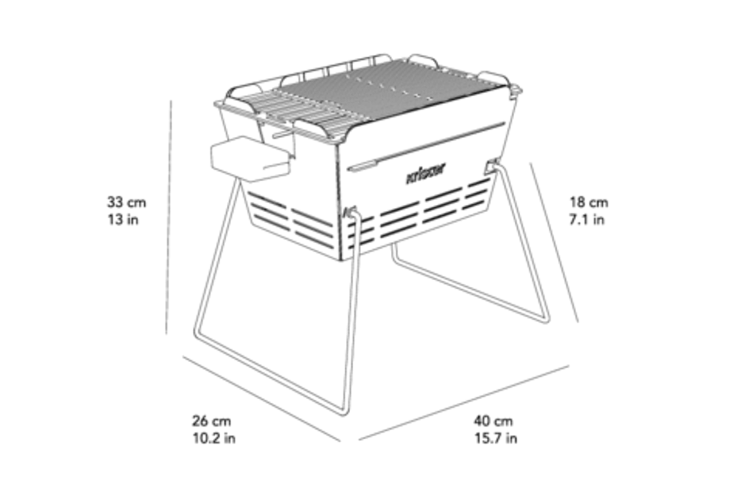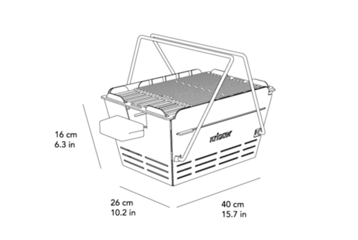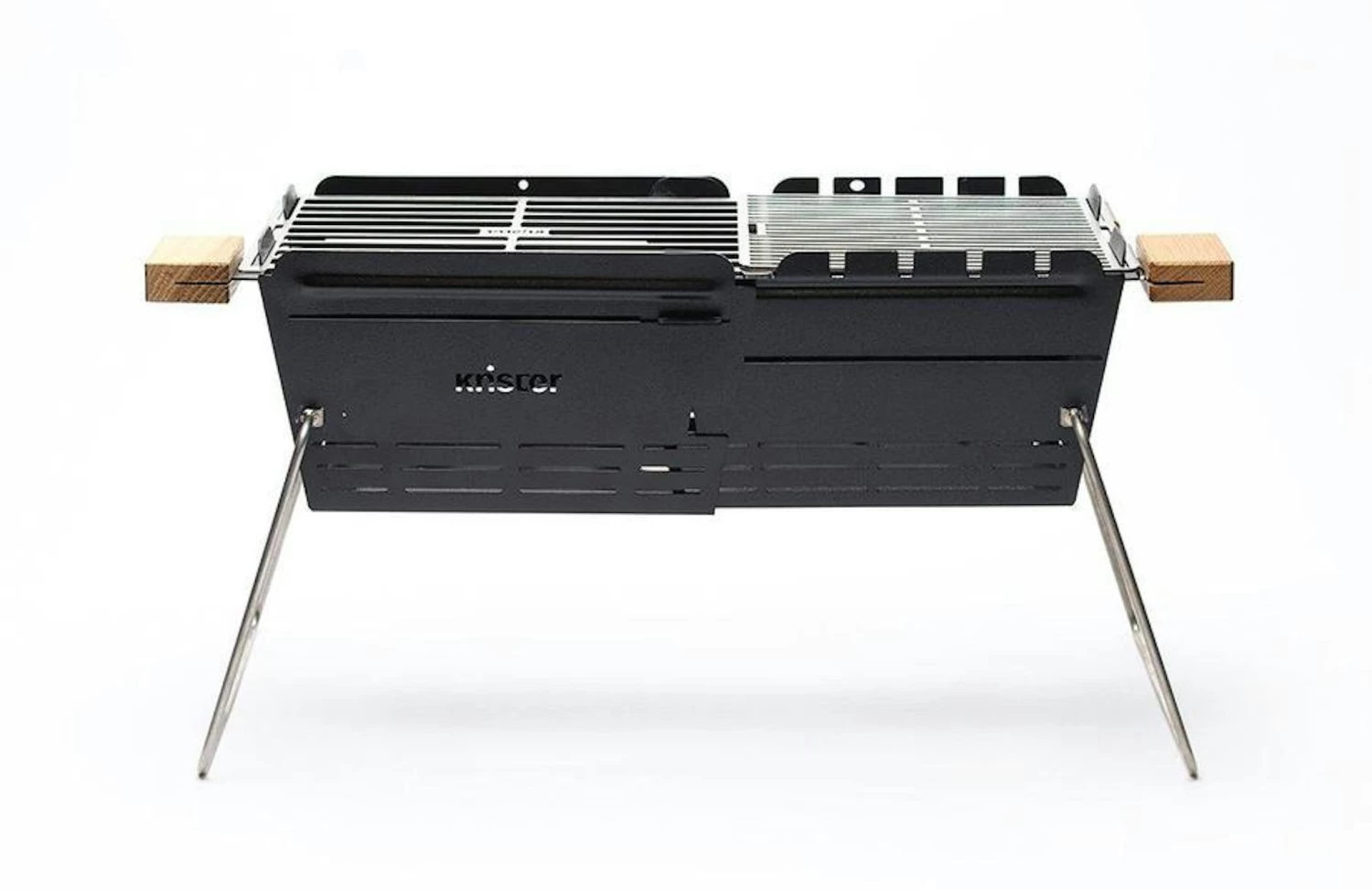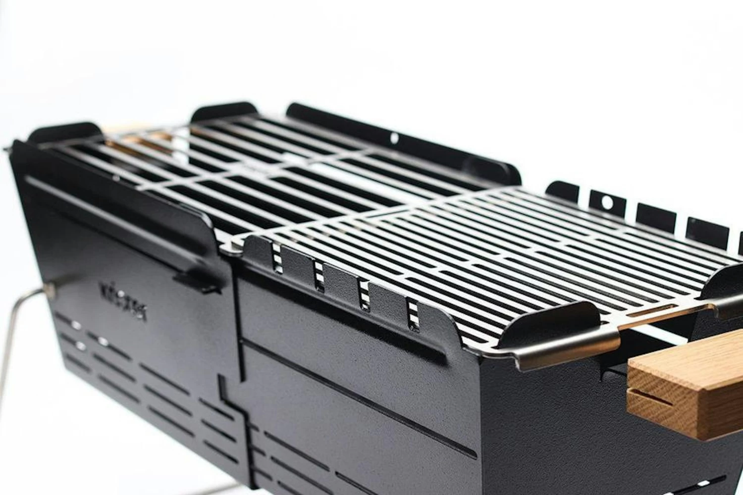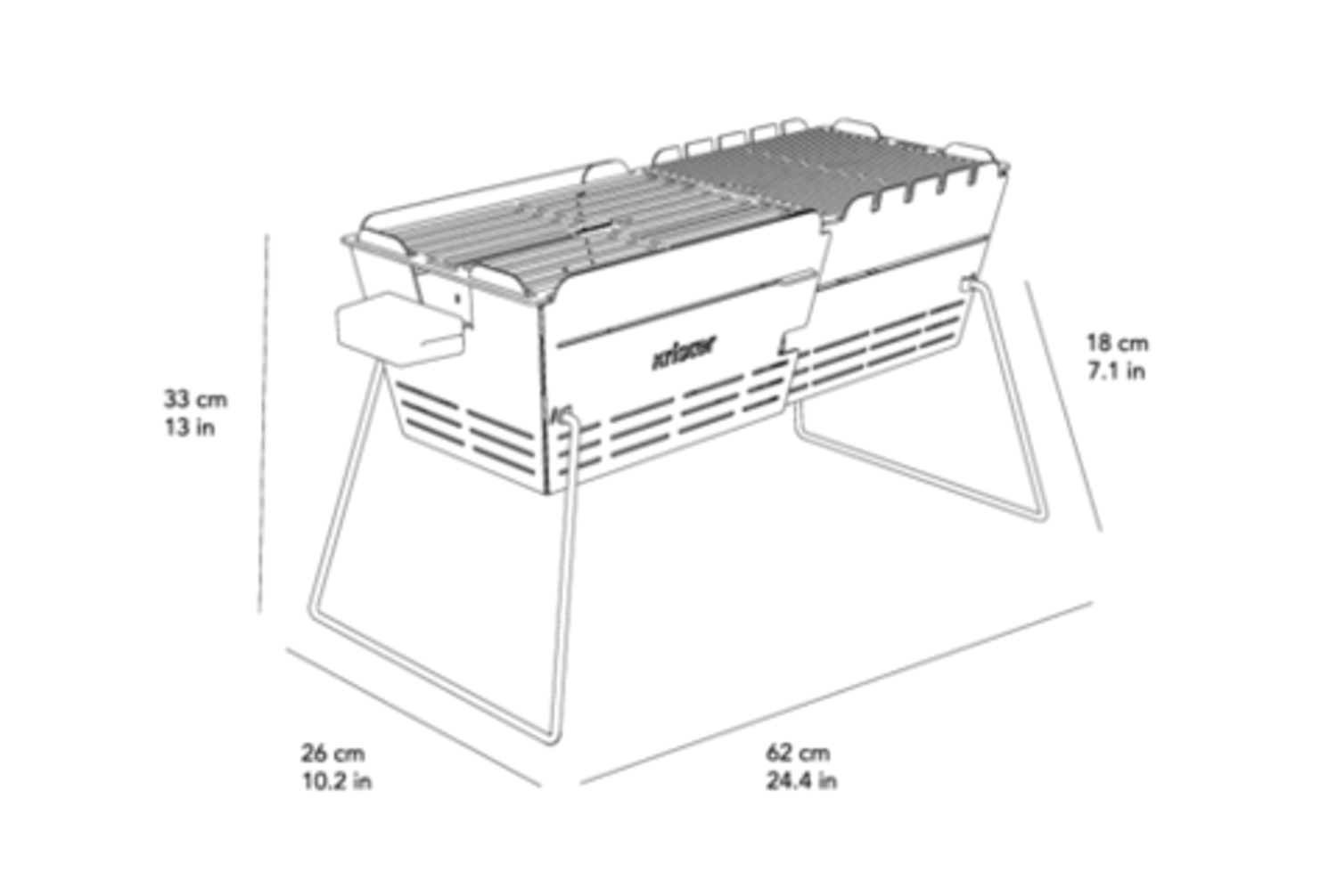 Der Knister Grill Origina l lässt sich auf die doppelte Größe auseinanderziehen. Dazu einfach den Grill auf den Boden stellen, Henkel nach oben klappen, leicht auseinanderziehen und die Roste wieder hineinlegen. Der Knister Original kann sowohl im kleinen als auch im großen Zustand verwendet werden. Lasse ihn klein, wenn ihr nur zu zweit seid, vergrößere ihn, wenn ihr mit vielen Freunden grillt. Grillfläche: 20,0 x 28,0 bis 50,0 cm