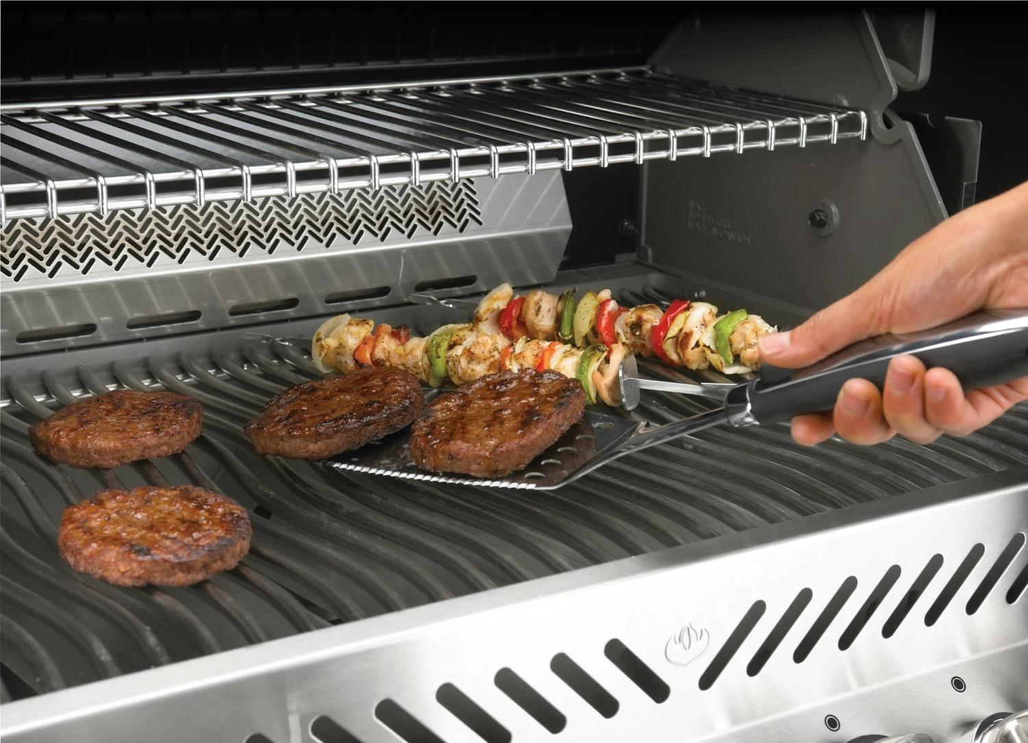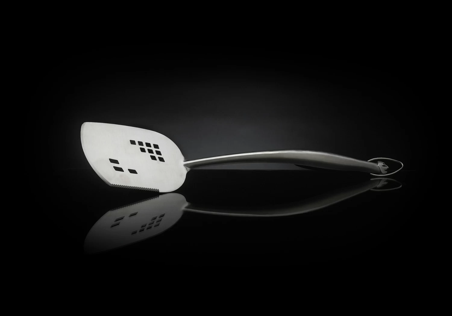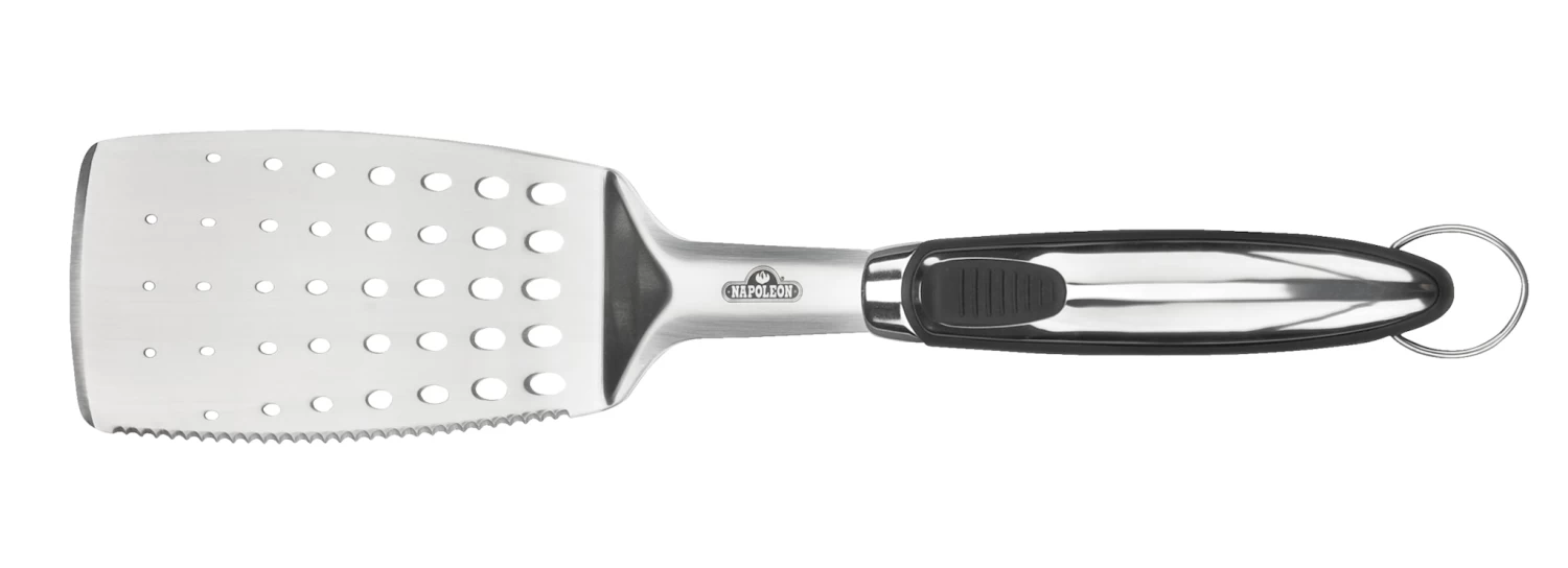 Der NAPOLEON Grillwender aus hochwertigem Edelstahl ist ein Multitalent und besitzt eine extra große Wendefläche. Es ist überhaupt kein Problem zwei Burger oder zwei Steaks gleichzeitig zu wenden. Zum Multitalent wird der Grillwender aber durch die scharfe Schneidekante vorne, sowie die Schnittfläche an der Seite. So können Sie Ihr Grillgut bereits auf dem Grill einfach portionieren. Zur einfachen Handhabung wurde der NAPOLEON Grillwender mit einem gummierten, ergonomisch geformten Griff ausgestattet.
