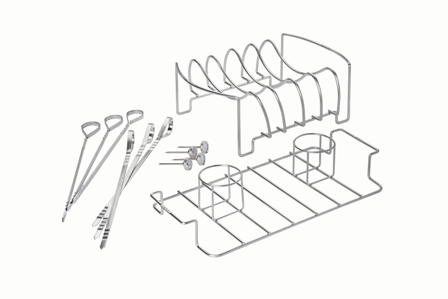 Das NAPOLEON Starter-Set für Fleisch-Liebhaber beinhaltet einen Edelstahl Spare-Ribs- und Bratenhalter, einen Edelstahl 2-fach-Bierdosenhähnchen-Halter, sechs Edelstahl Spieße und vier Taschenthermometer. 1x Edelstahl Spare-Ribs- und Bratenhalter 1x Edelstahl 2-fach-Bierdosenhähnchen-Halter 6x Edelstahl Spieße (33,5 cm) 4x Taschenthermometer