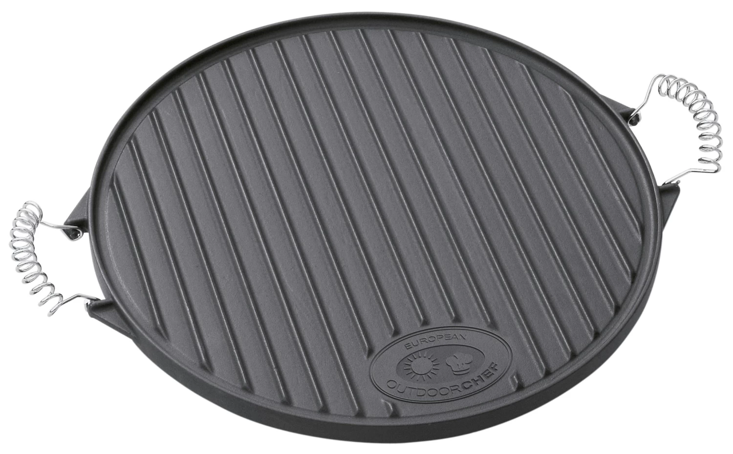 2-seitige Grillplatte aus Gusseisen mit optimaler Hitzespeicherung und -verteilung: gerippte Seite für Kurzgebratenes, flache Seite u. a. für Eierspeisen und köstliche Crêpes.