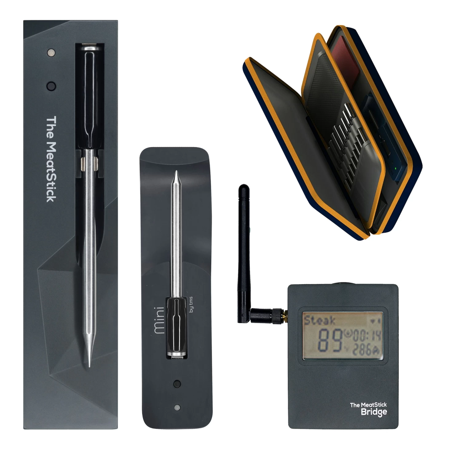 Höchsten Temperaturen und extremen Kochumgebungen hält The MeatStick problemlos stand. Es ist ganz einfach: Thermometer ins Fleisch stecken, App starten und los geht’s mit bis zu 8 Thermometern gleichzeitig in einer App mit beliebig vielen Endgeräten, die Zugriff haben. Lieferumfang: 1x The Meat Stick MiniXtander 1x The MeatStick 1x WiFi Bridge inkl. Ladegeräte & Tasche Bluetooth-Reichweite: Bis zu 90 Meter Internet: unbegrenzt